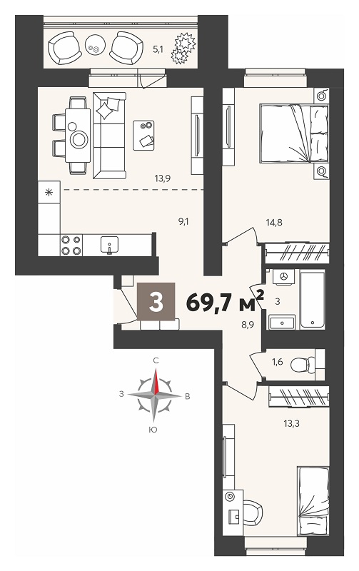 3-комнатная