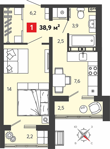 Площадь: 39 м²